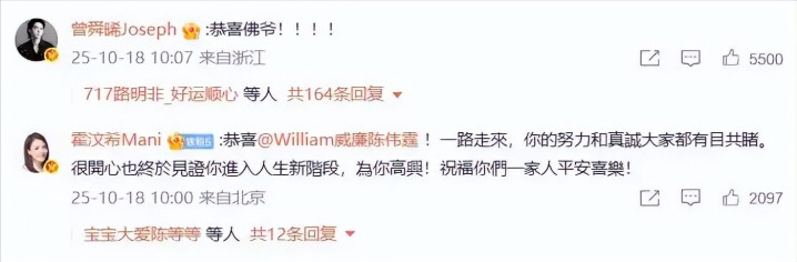 直到2025年10月18日,陈伟霆和何穗官宣生子,两人发文 “爸爸、妈妈还有他”,并晒出了拥抱及B超照片,还有陈伟霆抱着儿子出镜的照片。